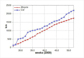 La fine dell’anno e’ tempo di bilanci… cosi’ eccoci a valutare come e’ andata la sfida tra auto e bici in casa sacchibelli. Abbiamo cominciato a conteggiare i km percorsi dall’elemento maschile di casa sacchibelli a partire dalla week 27 e al tempo stesso abbiamo annotato i km percorsi con l’auto. Alla fine ha vinto l’auto, ma lo scarto e’ piccolo e in prospettiva (considerando l’eccezionalita’ di questo periodo, con il preannunciato arrivo di cicogne) i sacchibelli non escludono di riuscire a dimostrare che e’ possibile vivere senza essere completamente schiavi dell’auto, anche in paesi, come l’Italia, dove la cultura della bicicletta e’ decisamente poco sviluppata. Ecco comunque il grafico riassuntivo di questa appassionante sfida. Alla fine l’auto ha vinto per 2206 km contro i 1738 percorsi in bici. Considerando che la nostra auto percorre circa 15 km con un litro, nella seconda meta’ del 2009 abbiamo consumato circa 147 litri di benzina. Di sicuro non abbiamo arricchito i petrolieri locali e, forse, Al Gore puo’ essere fiero di noi.